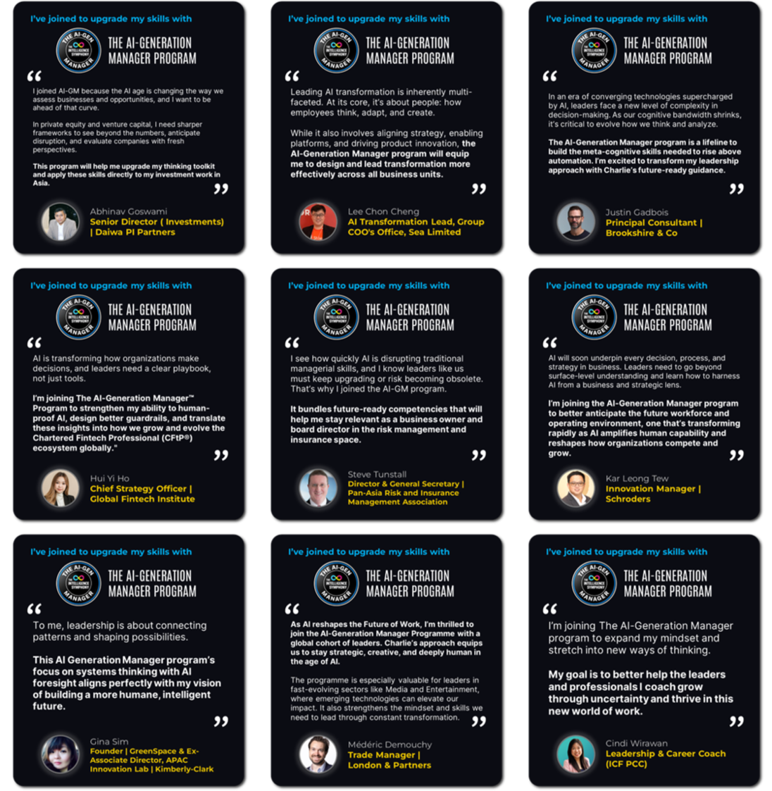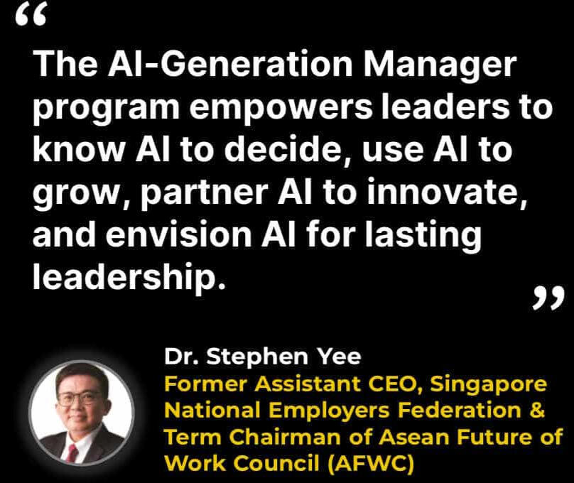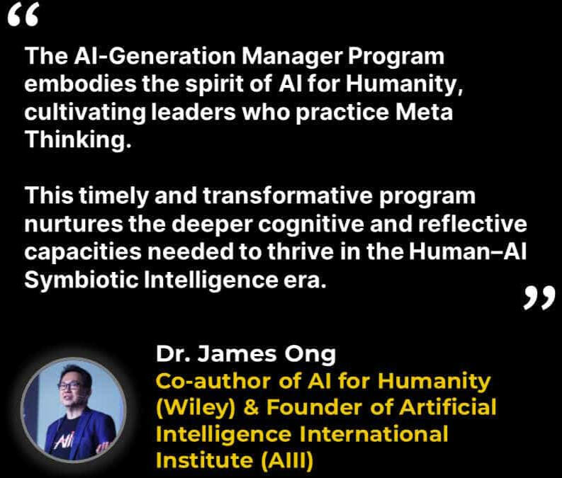 The AI-Generation Manager Program:• is an applied learning cohort-based journey for managers to raise their game and future-proof their careers in the age of AI.• equips you with future-ready and higher-order capabilities, so you do not just keep up with AI, you rise above it.• is tailored for practical, everyday leaders who shoulder the responsibility of turning strategy into reality, guiding teams through change, and driving results under uncertainty.• blends futurist insights, guided instruction, interactive learning, case-based exercises, and a capstone project• ensures that you not only learn new frameworks but also apply them immediately and effectively.