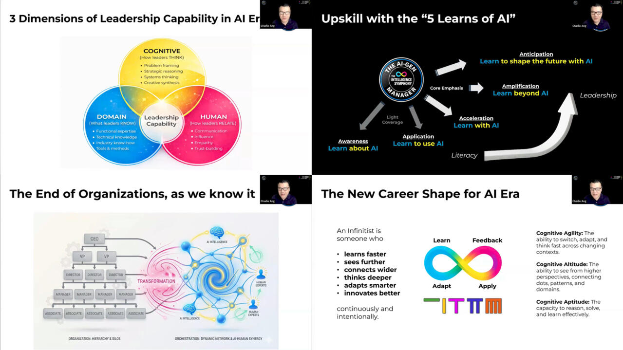 Digital intelligence is disrupting how work is designed, how decisions are made, and how organizations operate.Across industries, organizations are re-architecting how work gets done. Companies are being re-engineered from the inside out, with AI shifting from the edges of productivity to the core of work.This is the hybrid Human-AI operating model, or what AI futurist and future of work strategist Charlie Ang calls the AI-Generation Workforce.In this emerging landscape, AI handles increasing amounts of execution, analysis, and optimization, while humans operate above machines at a higher strategic and creative plane.This closed-door executive briefing will explore what this shift truly means for leadership capability, workforce readiness, talent strategy, and learning and development.The session examines the deeper operating implications of the AI-Human era: